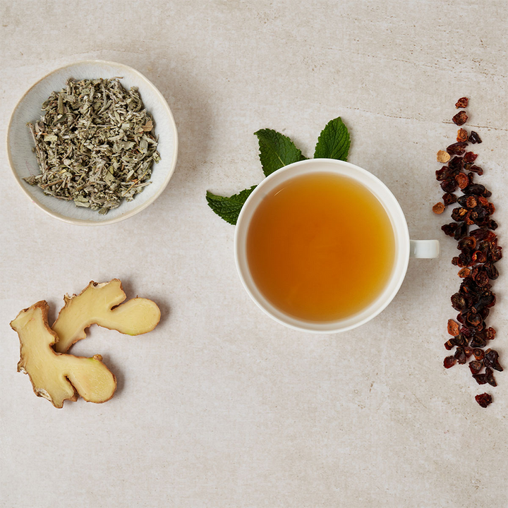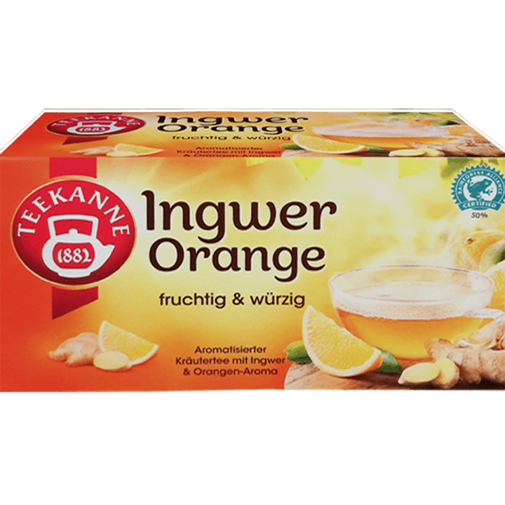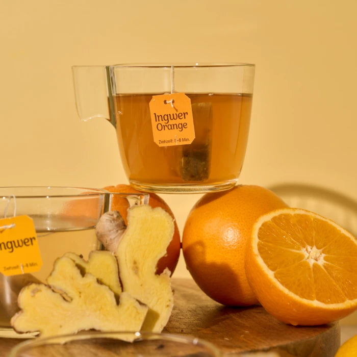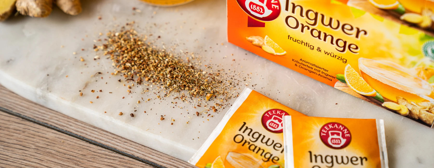 Lasa-te cucerit de Ingwer-Orange: acest ceai de plante combina ghimbirul condimentat cu gustul portocalelor coapte la soare. Un ceai ca un spectacol de culori pe orizont – sau, pur si simplu, o invitatie la mici momente de pauza in rutina zilnica.