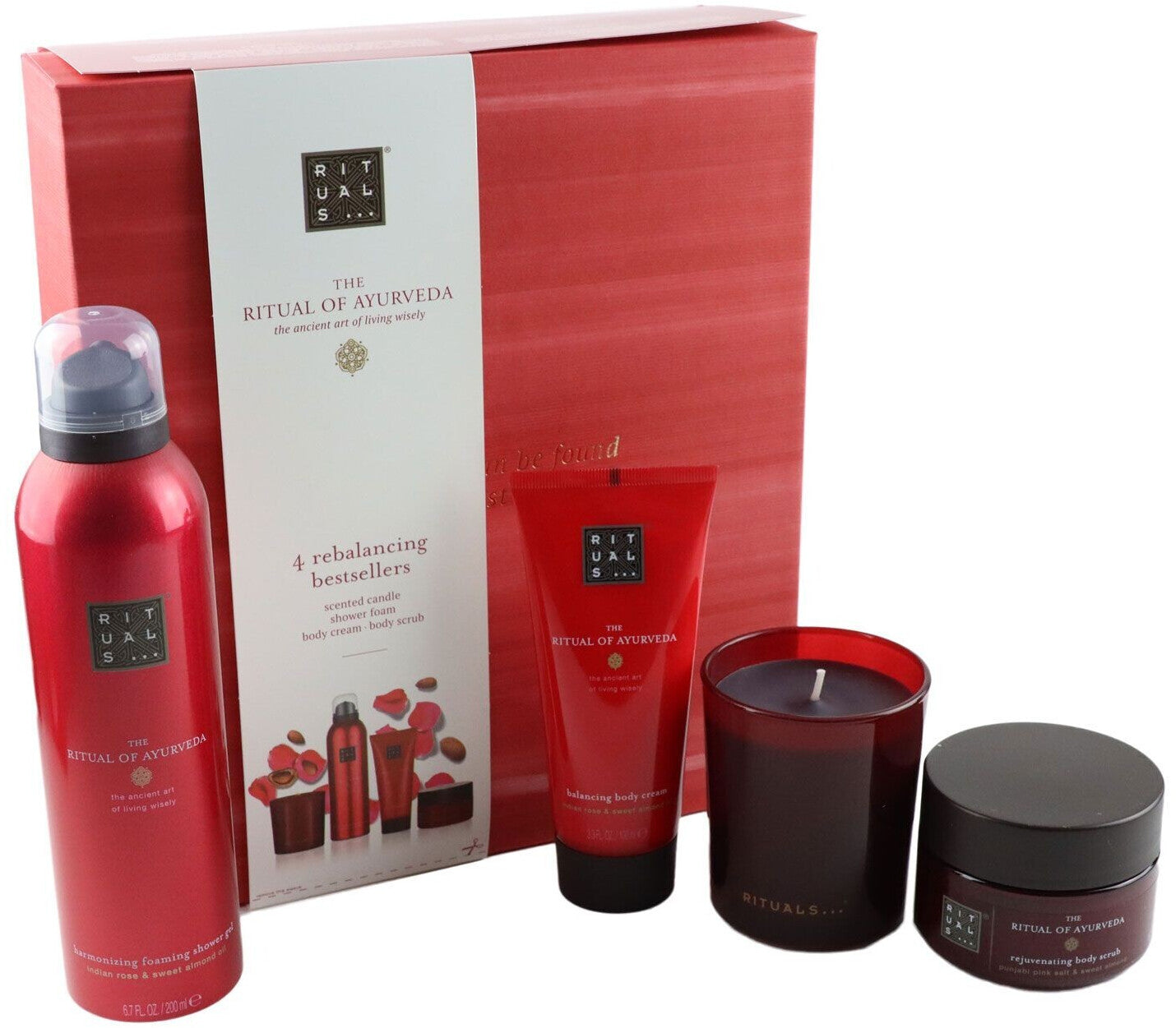 The Ritual of Ayurveda Body Cream: Aqua/Water, Cetearyl Alcohol, Glycerin, Caprylic/Capric Triglyceride, Propylheptyl Caprylate, Undecane, Helianthus Annuus (Sunflower) Hybrid Oil, Parfum/Fragrance, Prunus Amygdalus Dulcis (Sweet Almond) Oil, Rosa Damascena Flower Oil, Tocopheryl Acetate, Allantoin, Tocopherol, Ubiquinone, Tridecane, Isohexadecane, Cetyl Palmitate, Ceteareth-20, Glyceryl Stearate, Propylene Glycol, Carbomer, Sodium Polyacrylate, Ceteareth-12, PEG-40 Hydrogenated Castor Oil, Phenoxyethanol, Caprylyl Glycol, Potassium Sorbate, Benzyl Alcohol, Sodium Benzoate, Linalool, Hexyl Cinnamal, Limonene, Coumarin, Citronellol, Benzyl Benzoate, Geraniol, Cinnamyl Alcohol, Citral, Sodium Hydroxide, Citric Acid.The Ritual of Ayurveda Candle: See WARNINGThe Ritual of Ayurveda Body Scrub: Sodium Chloride, Maris Sal/Sea Salt, Ethylhexyl Stearate, Isopropyl Myristate, Carthamus Tinctorius (Safflower) Seed Oil, Parfum/Fragrance, Prunus Amygdalus Dulcis (Sweet Almond) Oil, Prunus Amygdalus Dulcis (Sweet Almond) Shell Powder, Persea Gratissima (Avocado) Oil, Macadamia Integrifolia Seed Oil, Argania Spinosa Kernel Oil, Simmondsia Chinensis (Jojoba) Seed Oil, Helianthus Annuus (Sunflower) Seed Oil, Moringa Oleifera Seed Oil, Cocos Nucifera (Coconut) Oil, Rosa Centifolia Flower Extract, Tocopherol, Menthol, Benzyl Benzoate, Citronellol, Coumarin, Hexyl Cinnamal, Linalool, Limonene.The Ritual of Ayurveda Foaming Shower Gel: Aqua/Water, Sodium Coco-Sulfate, Decyl Glucoside, Isopentane, Coco-Glucoside, Glycerin, PEG-120 Methyl Glucose Dioleate, Isopropyl Palmitate, Parfum/Fragrance, Isobutane, Rosa Damascena Flower Oil, Prunus Amygdalus Dulcis (Sweet Almond) Oil, Citric Acid, Sodium Benzoate, Guar Hydroxypropyltrimonium Chloride, Hexyl Cinnamal, Limonene, Linalool, Coumarin, Citronellol, Benzyl Benzoate.
